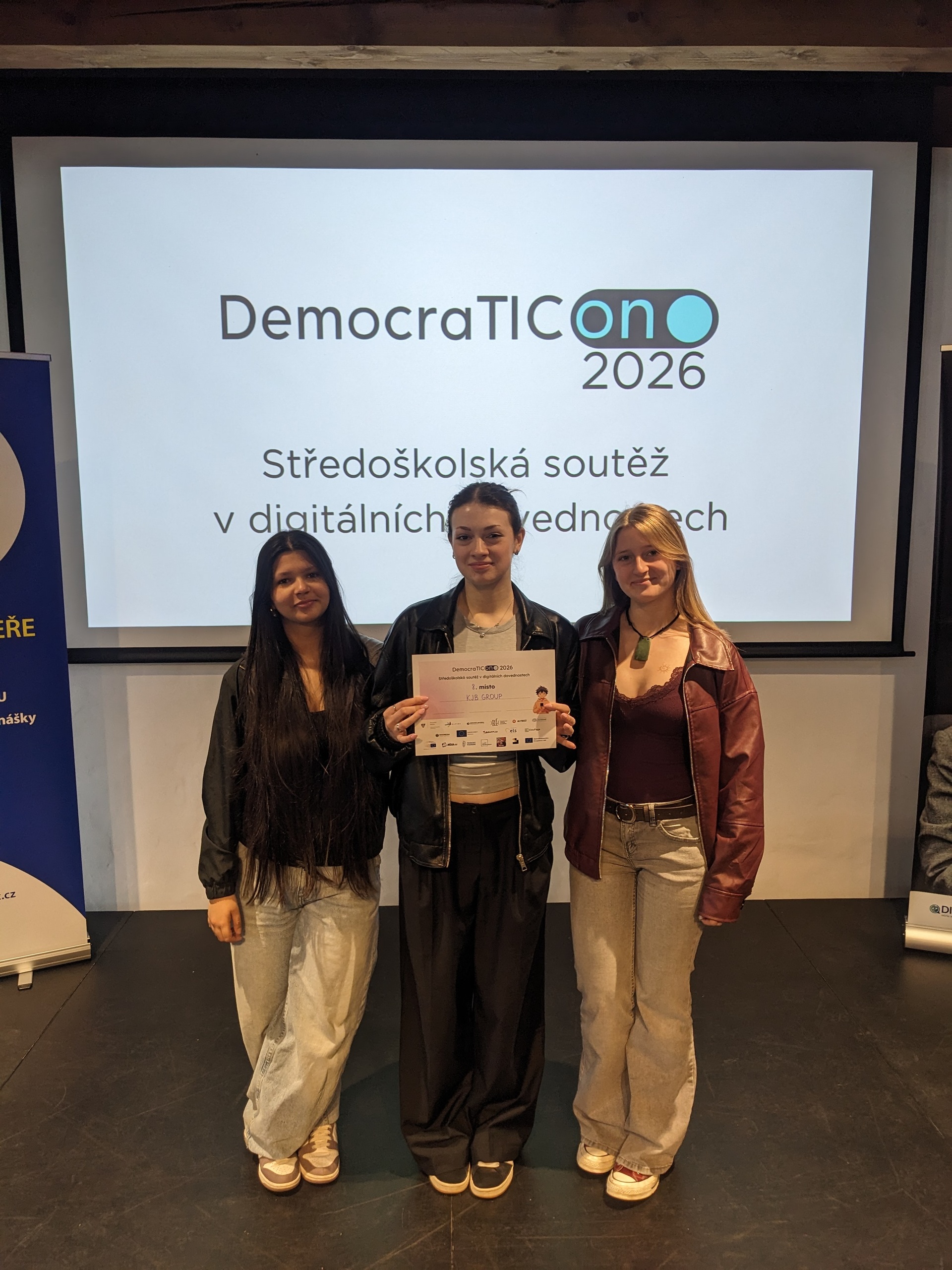 Žákyně Klaudie Durdová, Barbora Kolmanová a Johana Mariae (6.V) se 9.-10. dubna 2026 zúčastnily ústředního kola středoškolské soutěže v digitálních dovednostech DemocraTICon v Olomouci. Ústřední kolo se skládalo ze třech disciplín – tvorby vzdělávacího kurzu pro seniory, testu on-line dovedností se zaměřením na vyhledávání na internetu a vibe codingu (aplikaci, kterou děvčata vytvořila, se umístila na 3. místě; můžete si ji vyzkoušet na https://1url.cz/5eHsX). Žákyně obsadily krásné 8. místo a odvezly si spoustu zážitků a nových dovedností.