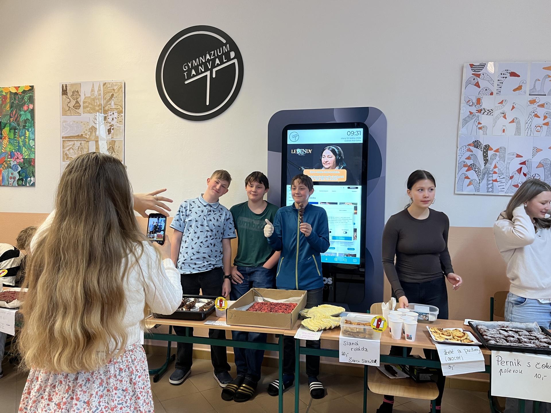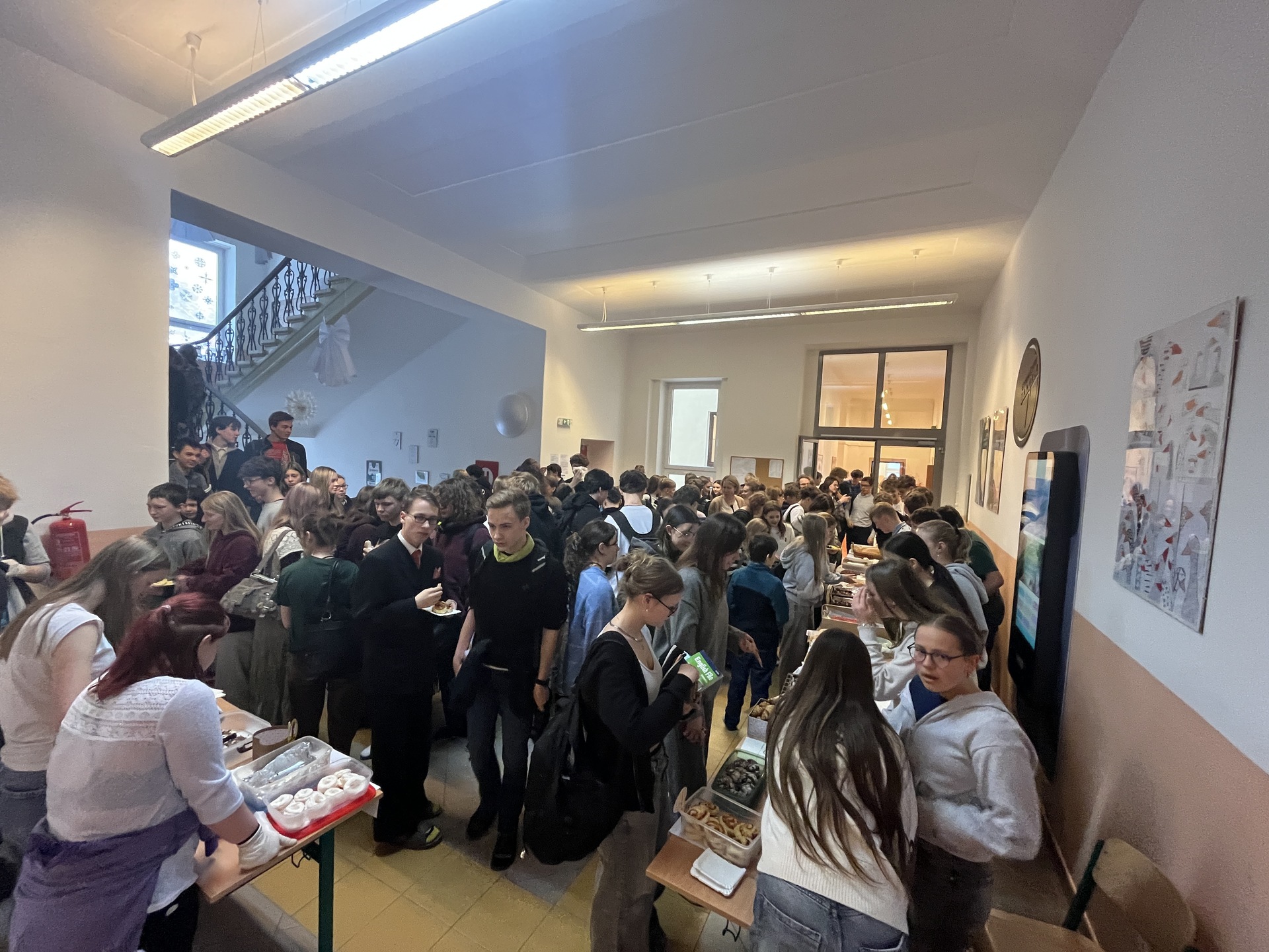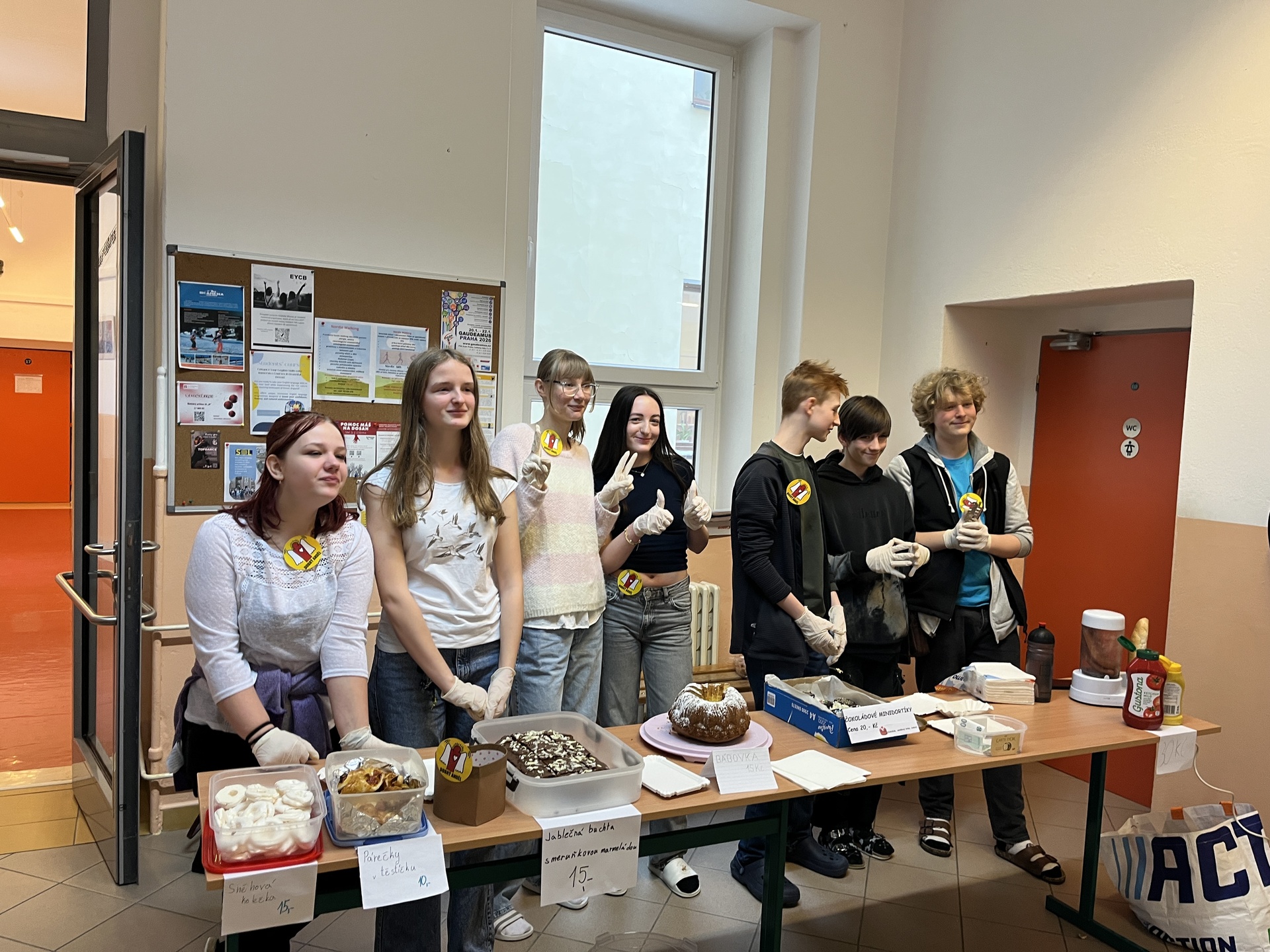 Tentokrát se do pečení nejrůznějších sladkých i slaných dobrot s nadšením pustili žáci 4.V. Během velké přestávky své výtvory nabídli všem, kteří si chtěli zpříjemnit den něčím dobrým. Výběr byl opravdu veliký! Na stolech se objevily medovníky, nadýchané cupcaky, minidortíky, různé variace perníků, palačinky, sněhová kolečka, bábovka, tvarohová buchta, crinkles, ale i zdravější svačinky – ovocné špízy nebo mandarinkové „jednohubky“ v čokoládě. Ani milovníci slaných pochoutek nepřišli zkrátka. V nabídce nechyběly oblíbené párky v rohlíku, pizza šneky či párky v těstíčku.