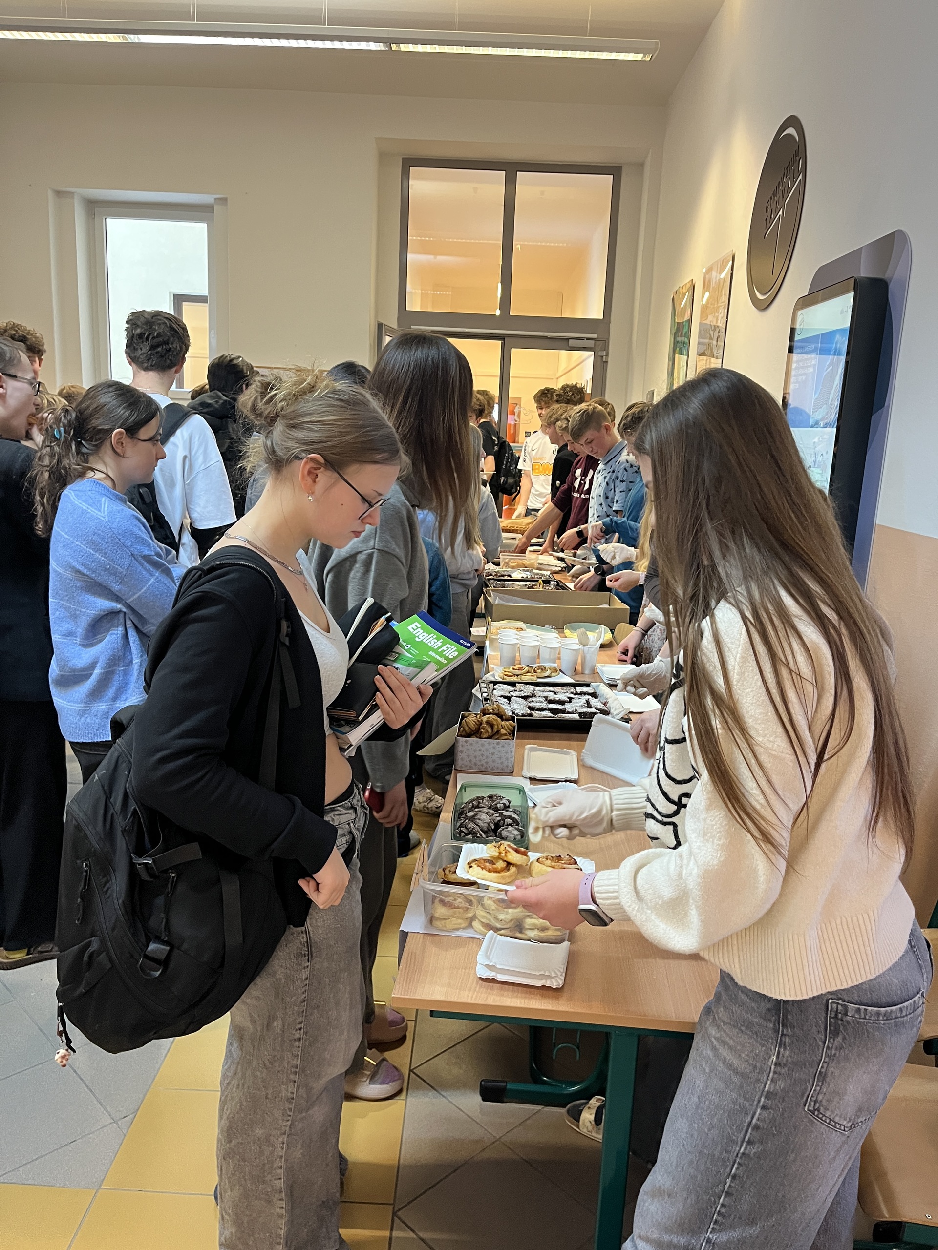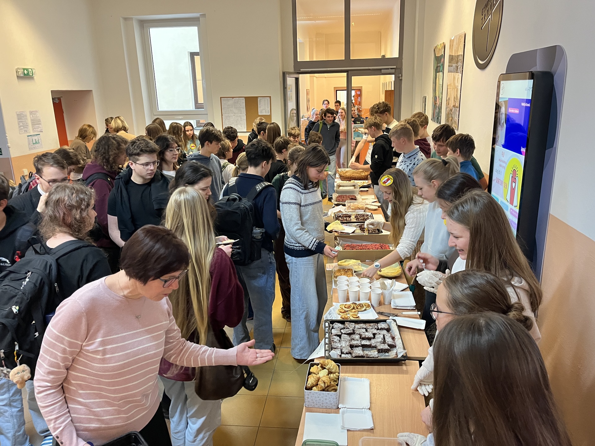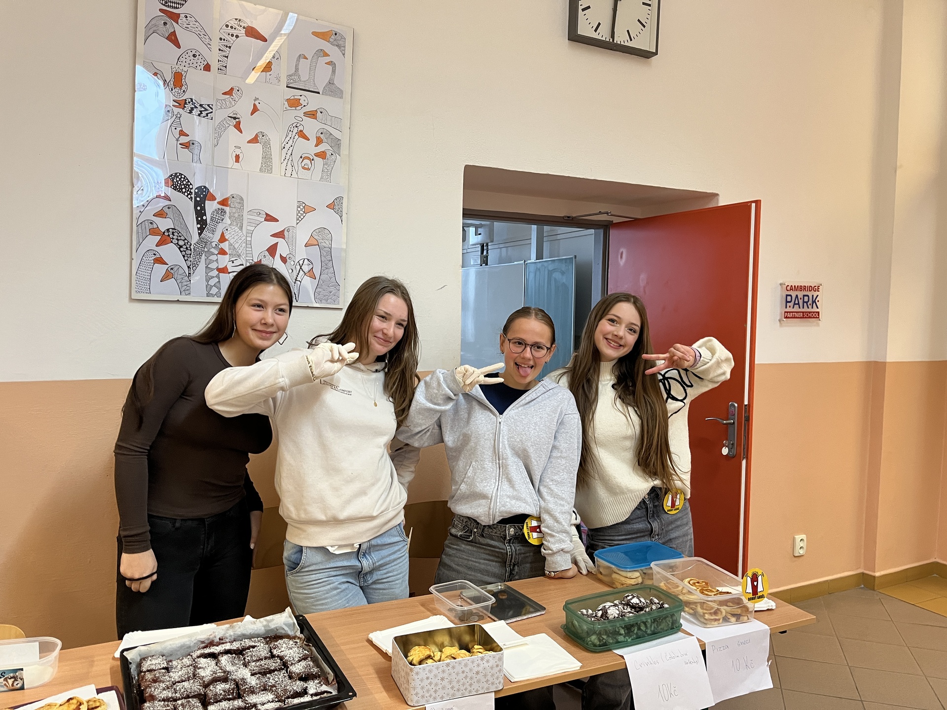 Tentokrát se do pečení nejrůznějších sladkých i slaných dobrot s nadšením pustili žáci 4.V. Během velké přestávky své výtvory nabídli všem, kteří si chtěli zpříjemnit den něčím dobrým. Výběr byl opravdu veliký! Na stolech se objevily medovníky, nadýchané cupcaky, minidortíky, různé variace perníků, palačinky, sněhová kolečka, bábovka, tvarohová buchta, crinkles, ale i zdravější svačinky – ovocné špízy nebo mandarinkové „jednohubky“ v čokoládě. Ani milovníci slaných pochoutek nepřišli zkrátka. V nabídce nechyběly oblíbené párky v rohlíku, pizza šneky či párky v těstíčku.