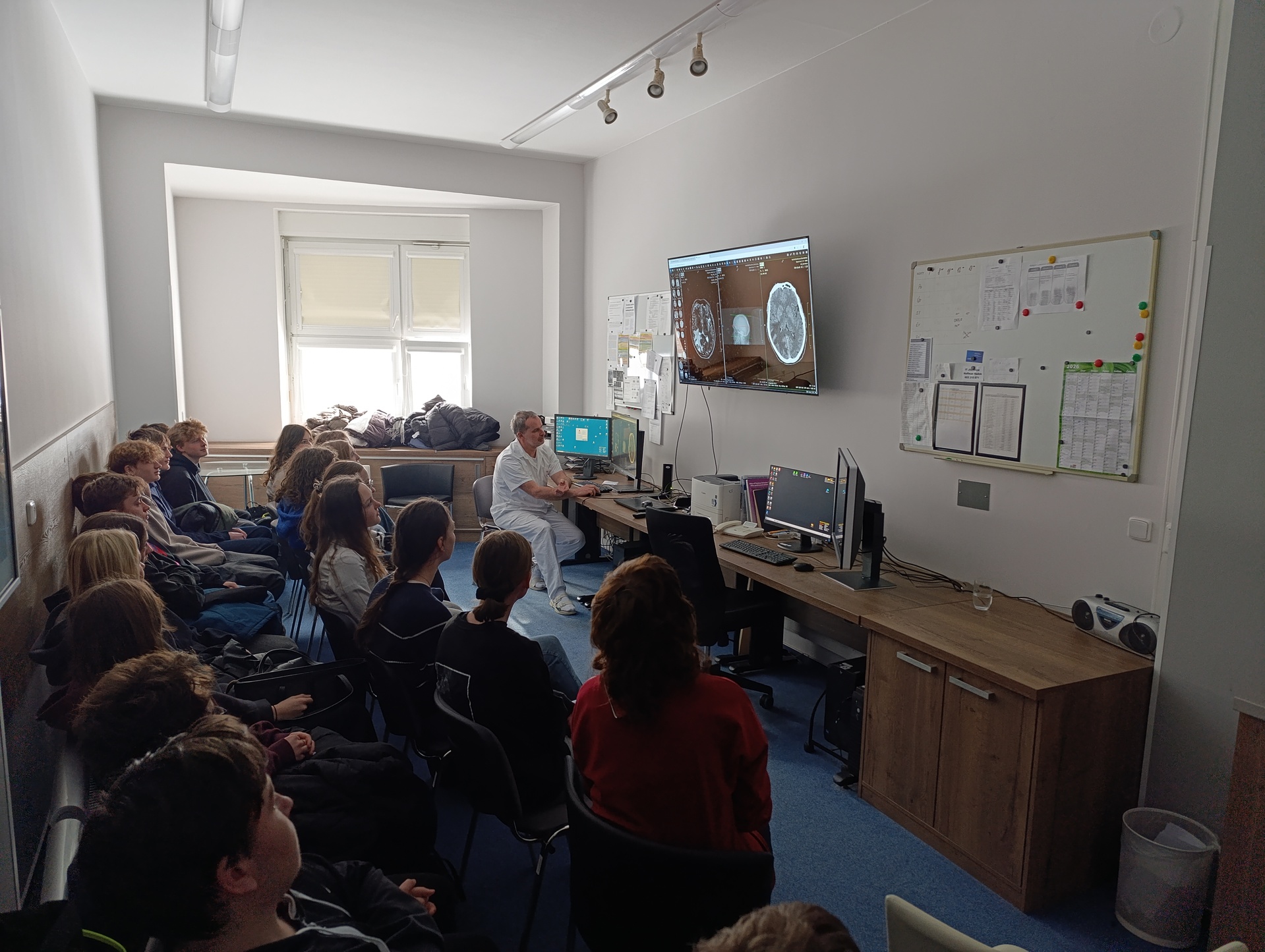 Zde si studenti a studentky nejprve vyslechli „přednášku“ MUDr. Jaromíra Frydrycha a Mgr. Filipa Rasochy, Dis. Obsah byl věnován diagnostickým metodám a principu jejich fungování, takže sextánům byl přiblížen obsah výrazů skiagrafie, skiaskopie, magnetická rezonance, počítačový tomograf atd. Následovala i prohlídka jednotlivých vyšetřoven, k vidění byl jeden z nejmodernějších počítačových tomografů v Evropě, zařízení magnetické rezonance či vyšetřovna pracující s ultrazvukovou technikou. Studenti měli jedinečnou šanci přesvědčit se o tom, že i regionální nemocnice může disponovat špičkovým vybavením a personálem.