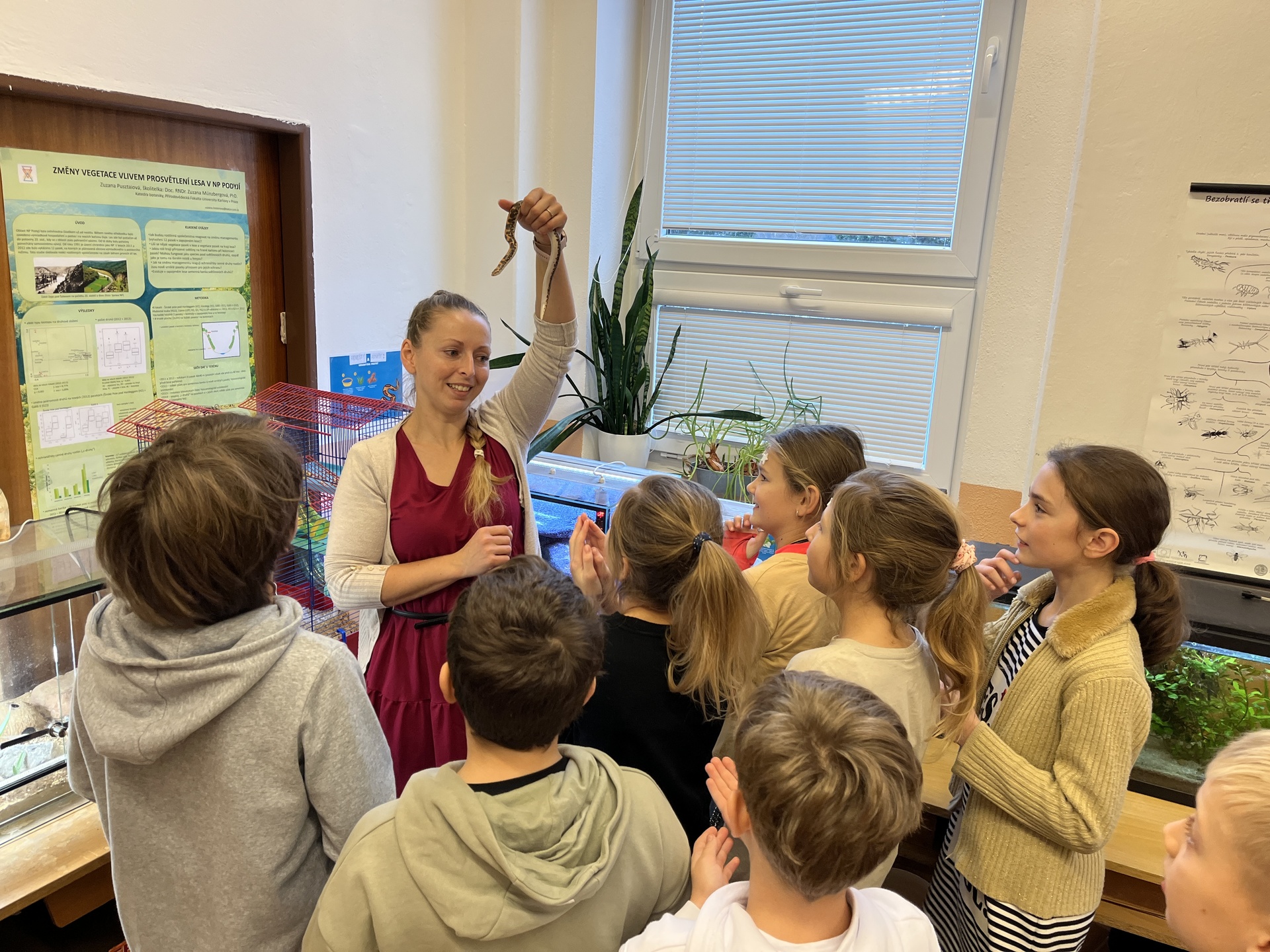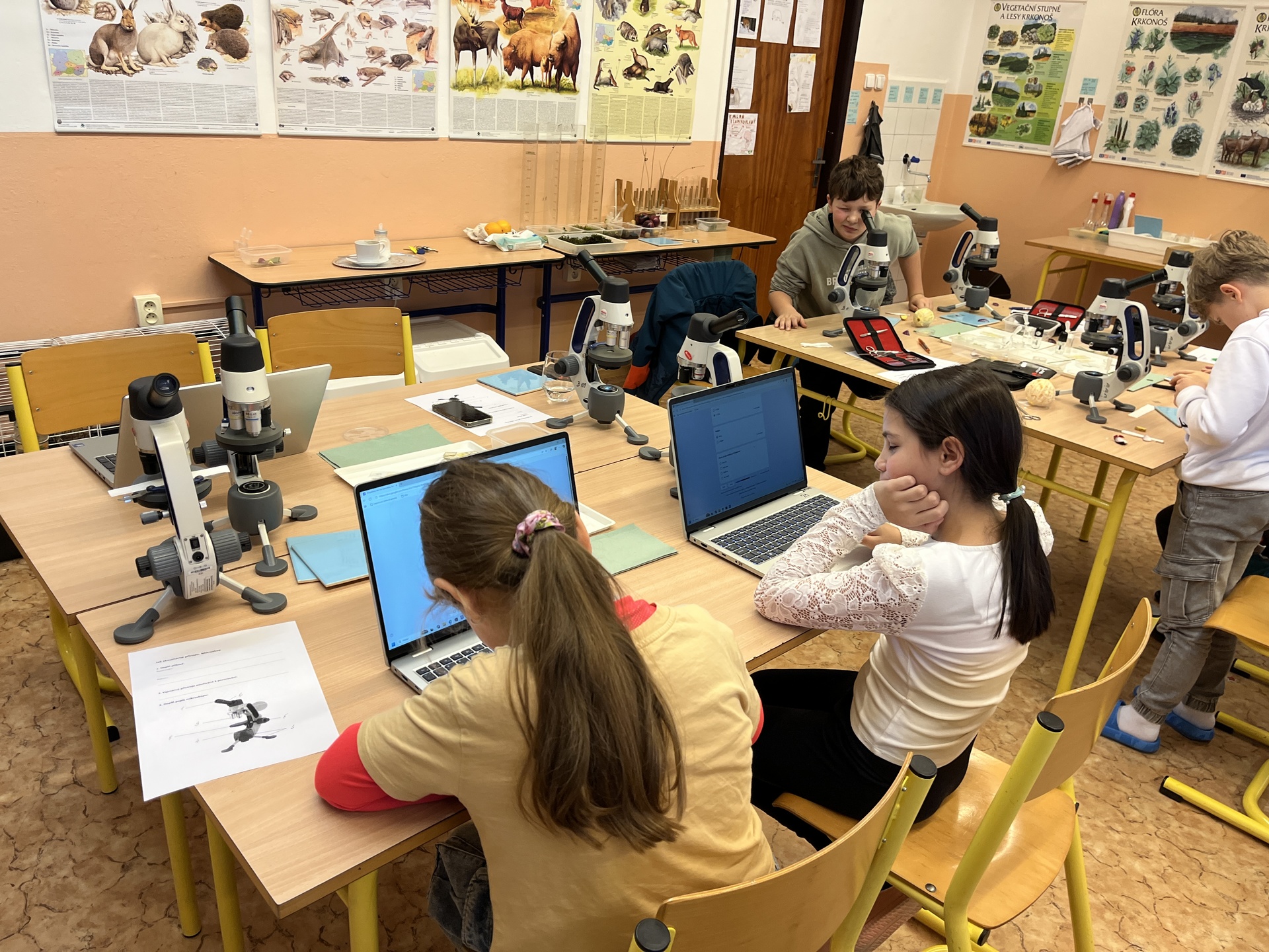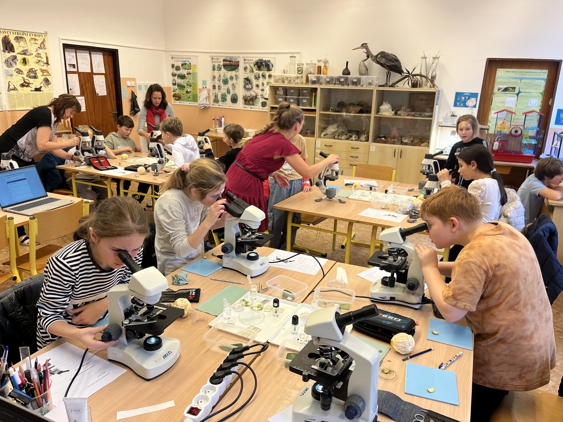 Biologie byla neméně zajímavá! Žáci se nejprve seznámili s našimi školními mazlíčky – hady jménem Arnošt1 a Artošt2, gekončíkem Flíčkem, křečkem Charlesem a pakobylkami. Poté se pustili do práce s mikroskopem, naučili se správně připravit preparát a objevovali detaily, které pouhým okem neuvidíte.