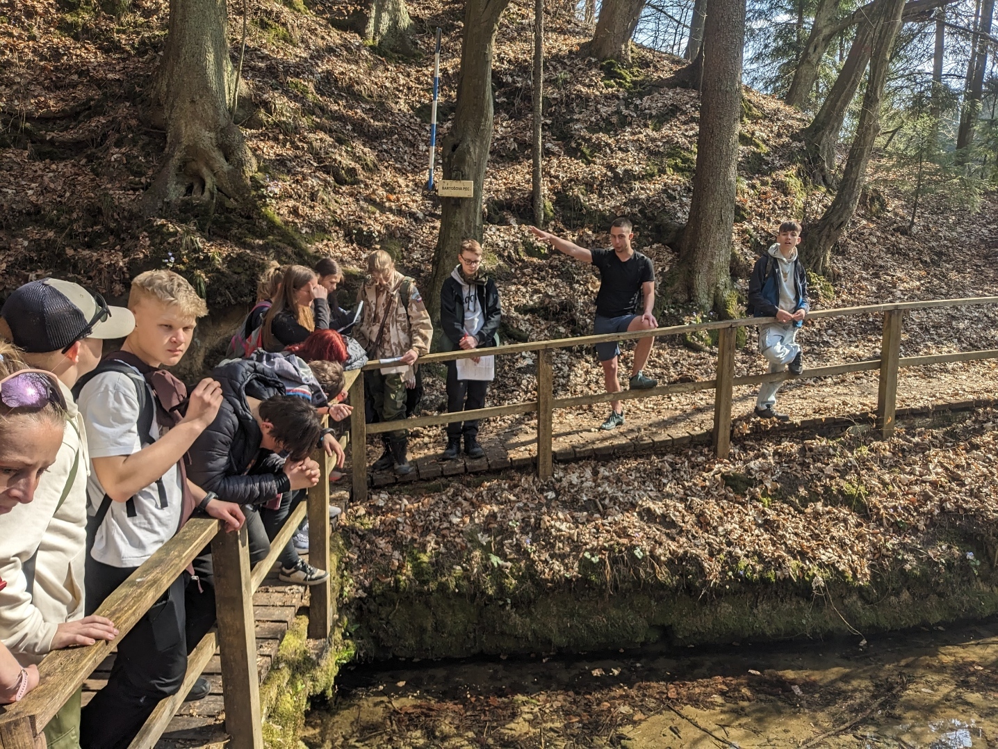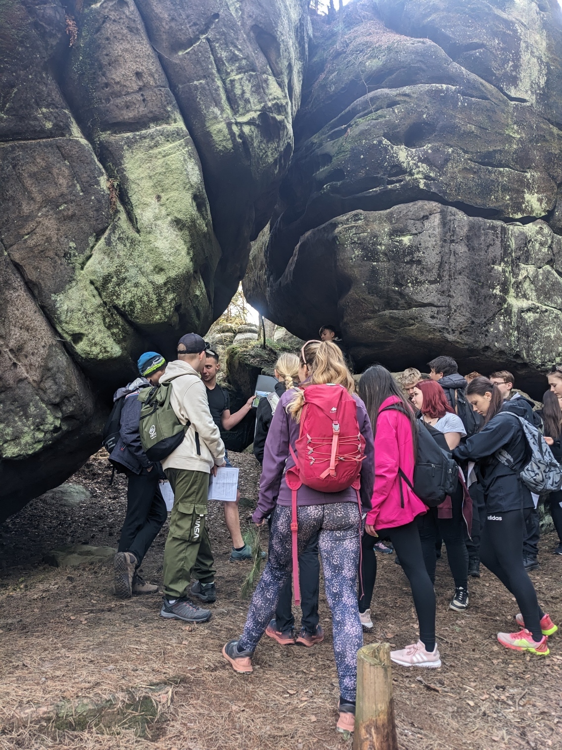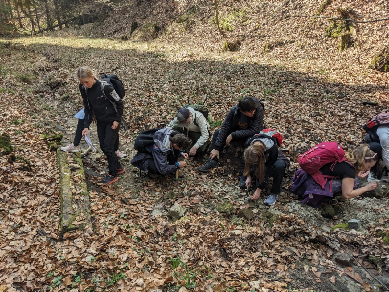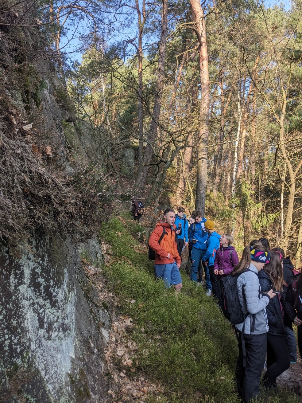Exkurzi jsme započali na vlakovém nádraží v Tanvaldu, odkud jsme se vlakem přesunuli do Malé Skály. Po krátkém rovinatém úseku podél Jizery jsme se museli vypořádat s prvním stoupáním na vyhlídku Zahrádka. Zde žáci obdrželi pracovní list a dozvěděli se o vzniku údolí rozprostírajícího se pod nimi. Na Vranovském hřebenu si také žáci vyzkoušeli měření sklonu trhlin v pískovcích. Poté jsme po neznačených cestách přesunuli do skalního města Maloskalská Drábovna, kde musela třída v terénu najít např. skalní bránu nebo skálu s různou hrubostí pískovce. Následně jsme se vypravili k Vazoveckému potoku, kde žáci s využitím geologických kladívek úspěšně vyhledali několik desítek zkamenělých schránek živočichů. Vzhledem k rychle ubíhajícímu času jsme pak svižným tempem došli k Bartošově peci, kde proběhl poslední odborný výklad. Odtud už to bylo slabou hodinku chůze do Dolánek, kde jsme počkali na vlak, který nás s přestupem v Železném Brodě odvezl zpět do Tanvaldu. Celou exkurzi hodnotím jako velmi zdařilou a děkuji Vilémovi, budoucímu učiteli, za její bezchybnou organizaci.