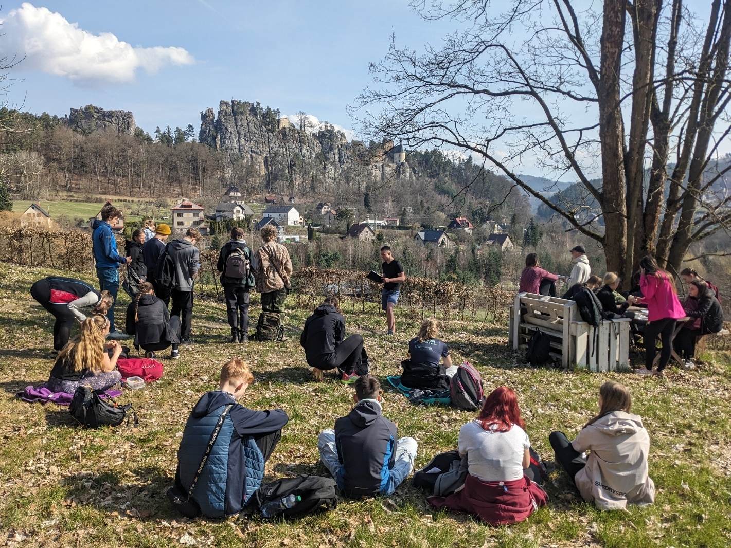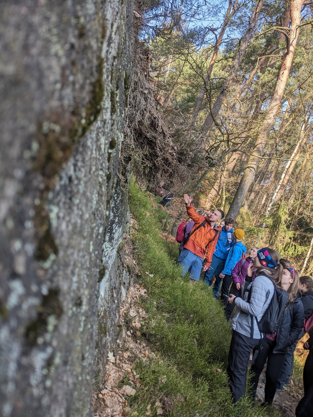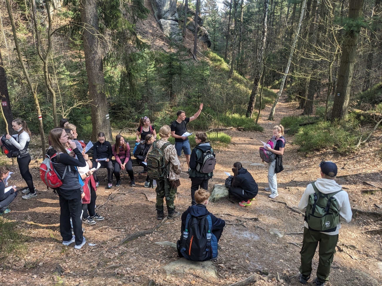 Exkurzi jsme započali na vlakovém nádraží v Tanvaldu, odkud jsme se vlakem přesunuli do Malé Skály. Po krátkém rovinatém úseku podél Jizery jsme se museli vypořádat s prvním stoupáním na vyhlídku Zahrádka. Zde žáci obdrželi pracovní list a dozvěděli se o vzniku údolí rozprostírajícího se pod nimi. Na Vranovském hřebenu si také žáci vyzkoušeli měření sklonu trhlin v pískovcích. Poté jsme po neznačených cestách přesunuli do skalního města Maloskalská Drábovna, kde musela třída v terénu najít např. skalní bránu nebo skálu s různou hrubostí pískovce. Následně jsme se vypravili k Vazoveckému potoku, kde žáci s využitím geologických kladívek úspěšně vyhledali několik desítek zkamenělých schránek živočichů. Vzhledem k rychle ubíhajícímu času jsme pak svižným tempem došli k Bartošově peci, kde proběhl poslední odborný výklad. Odtud už to bylo slabou hodinku chůze do Dolánek, kde jsme počkali na vlak, který nás s přestupem v Železném Brodě odvezl zpět do Tanvaldu. Celou exkurzi hodnotím jako velmi zdařilou a děkuji Vilémovi, budoucímu učiteli, za její bezchybnou organizaci.